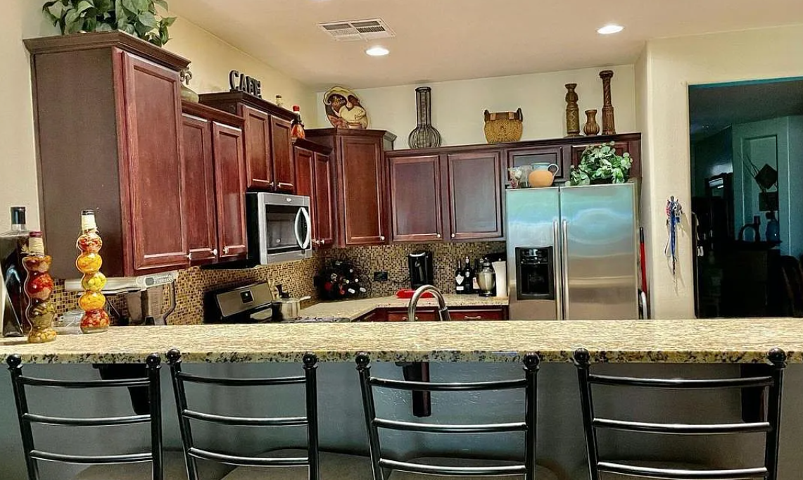 This home welcomes you with beautiful curb appeal and a well-designed floor plan. Inside, you’ll find tile flooring throughout, accented by large white baseboards for a clean, modern look. The kitchen features granite countertops, a mini mosaic tile backsplash, staggered maple chocolate cabinets with crown molding, a tall breakfast bar, gas stove, and a spacious walk-in pantry. Bedrooms offer large walk-in closets, while the family room includes a cozy fireplace. The backyard is lush and invitin